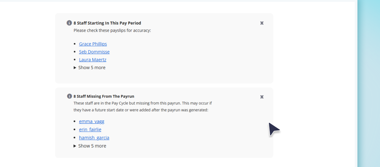 We've also added a clearer warning system to support this. The Staff Missing from the Pay Run warning will now only appear on pay runs with a payment date within the last 30 days, which eliminates false positives on historical pay runs. It also won't trigger on ad hoc pay runs.
